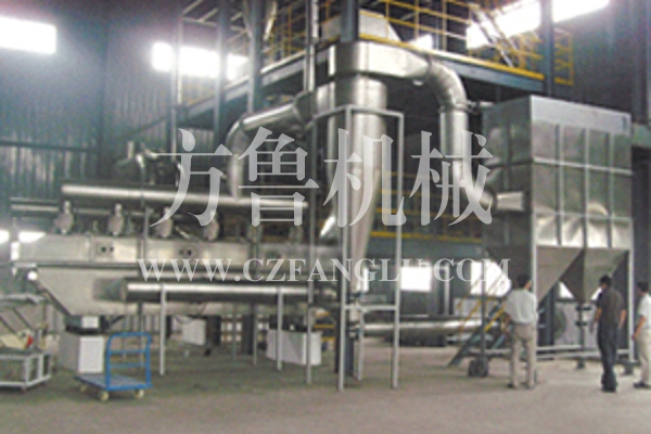 雞精有一定的粘性易粘在干燥機(jī)床面上造成干燥無法進(jìn)行。我公司為解決這一問題采取了多種措施。雞精擠壓造粒成型后,表面水份較高,我公司生產(chǎn)的流化床第一段采取了低溫大風(fēng)量預(yù)干燥,使雞精表面水份迅速降低,同時(shí)表面粘度也有所降低。流化床第二段采取中溫大風(fēng)量干燥,以進(jìn)一步降低雞精表面水份。流化床第三段采取中溫常規(guī)風(fēng)量干燥,使雞精在流化床內(nèi)有充分的停留時(shí)間以得到有效的干燥。流化床第四段采取大風(fēng)量冷卻,便于雞精在篩粉后能直接包裝。總之,為了滿足雞精在不同階段的工藝要求,床面的開孔率及開孔方向以及風(fēng)機(jī)選型均有相應(yīng)的設(shè)計(jì)規(guī)范。